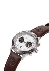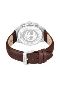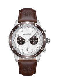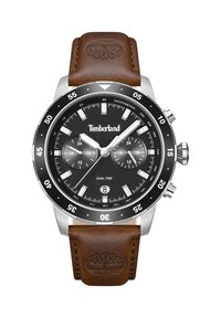 Montre-bracelet Timberland à double fuseau horaire avec cadran argenté, lunette marron, deux sous-cadrans, fenêtre pour la date, et bracelet en cuir marron embossé avec le logo arbre.