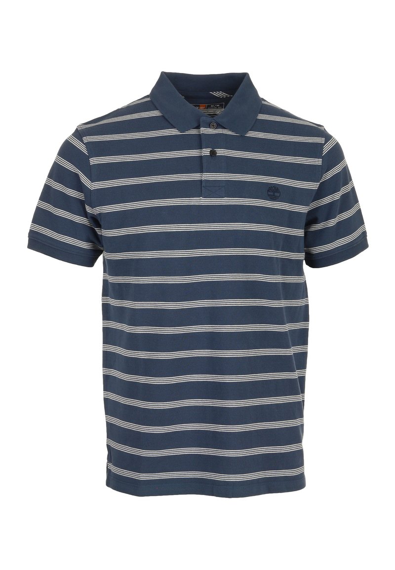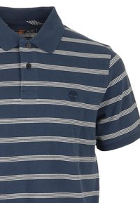 Polo bleu marine à manches courtes avec des rayures horizontales blanches et une patte de boutonnage à deux boutons, comportant un petit logo brodé sur la poitrine.