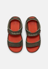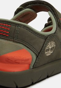 Sandale ouverte vert foncé avec brides réglables et semelle intérieure rouge, arborant le logo arbre Timberland sur le côté.
