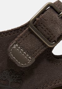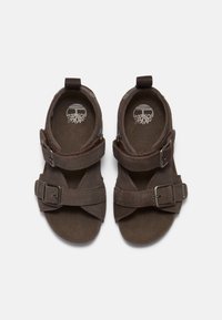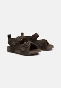 Sandale en daim marron avec deux brides ajustables à boucle, bout ouvert et languette de tirage au talon, dotée d'une semelle robuste et d'un logo en relief sur le côté.