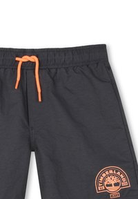 Shorts à taille élastique noire avec cordon orange et logo Timberland imprimé en orange sur la partie inférieure gauche de la jambe.