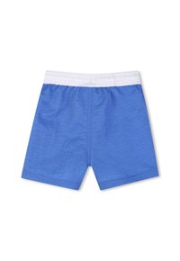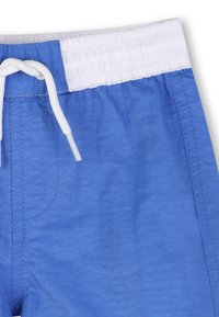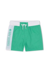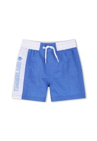 Shorts de bain pour garçons bleus et blancs avec cordon blanc et logo Timberland imprimé sur le côté gauche.