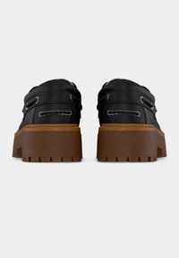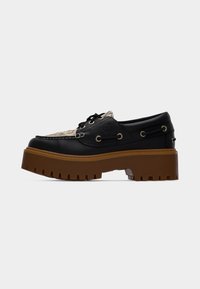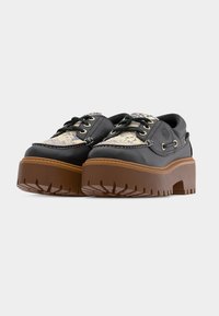 Chaussure bateau en cuir noir avec motif en peau de serpent beige et semelle épaisse à crampons marron, flottant au-dessus d'un sol en béton avec un fond de rideau blanc.
