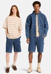Femme et homme debout côte à côte, portant des chemises rayées beige, des shorts en denim et des mocassins ; l'homme porte également une veste en denim et a des tatouages sur les jambes.