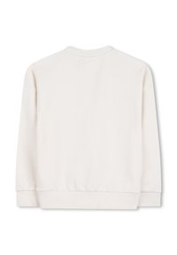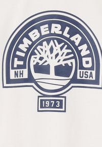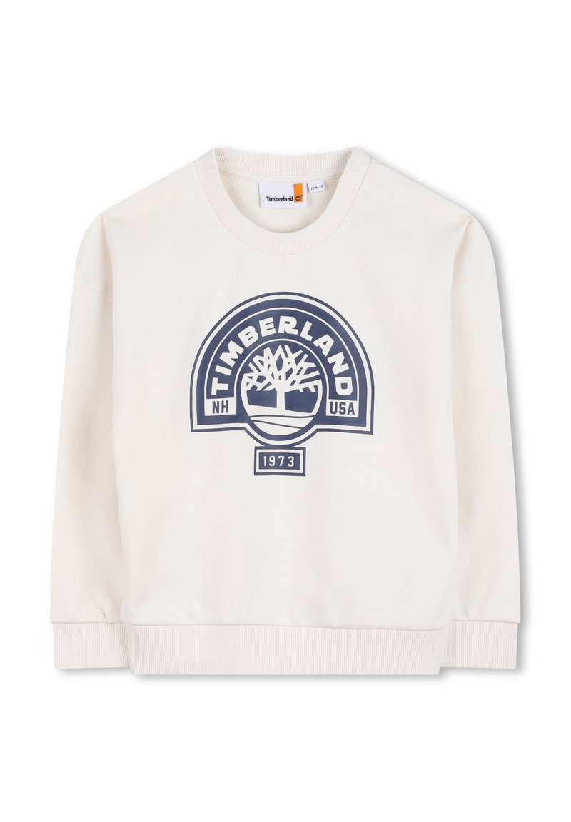 Sweat-shirt couleur crème, arborant un logo Timberland bleu avec un dessin d'arbre. Col rond et poignets côtelés ; tissu doux et texturé.