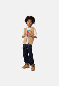 Veste beige portée sur un t-shirt blanc graphique, jean bleu foncé et bottes couleur tan. La veste présente un petit logo et des poches.