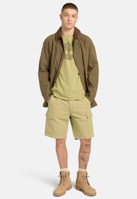 Jeune homme portant un t-shirt vert olive clair avec un logo d'arbre olive sombre et un short cargo assorti, debout devant un fond uni.
