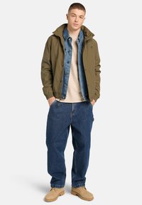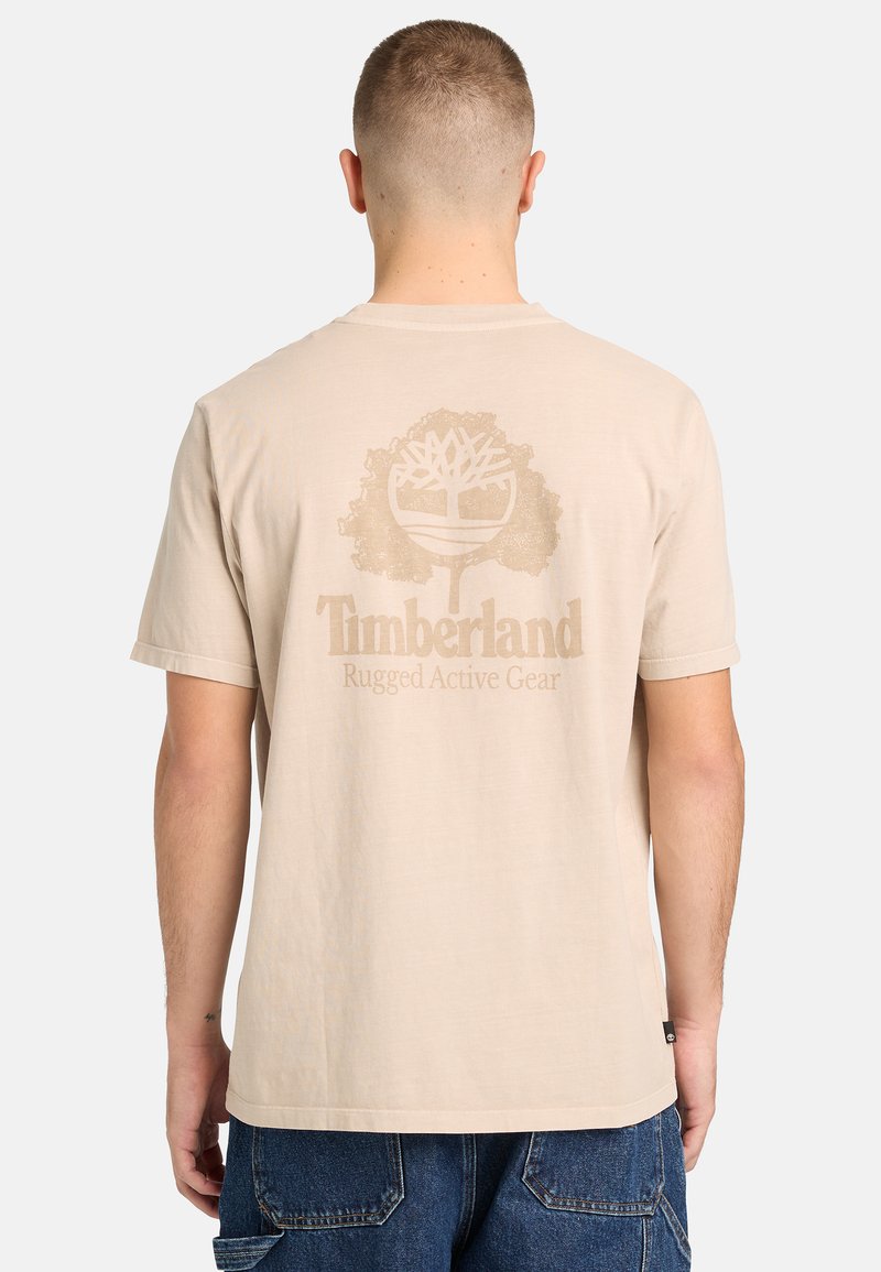 Homme vu de dos portant un t-shirt beige Timberland avec un logo d'arbre et le texte "Rugged Active Gear", associé à un jean en denim bleu.