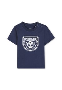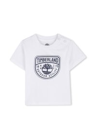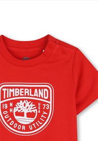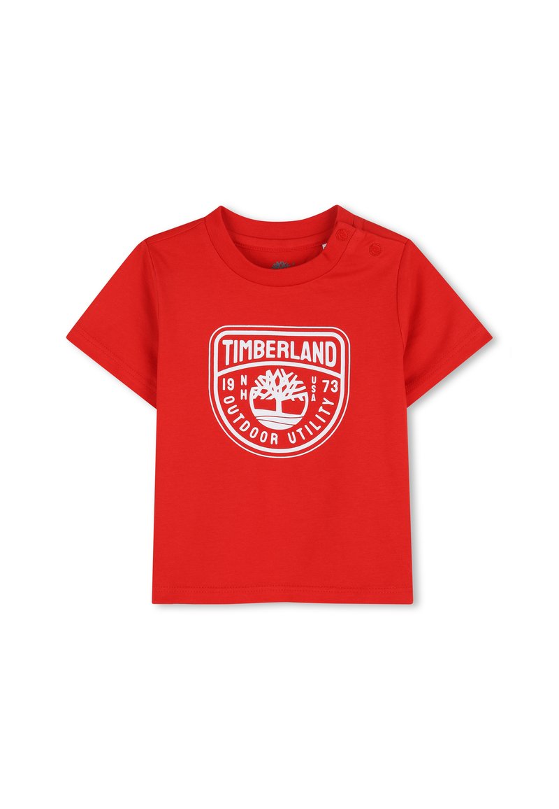 T-shirt rouge à manches courtes pour tout-petit avec logo Timberland blanc et pressions sur l'épaule gauche.