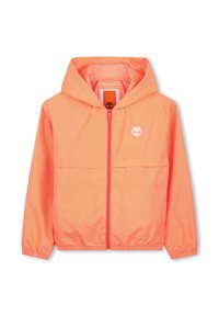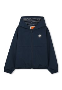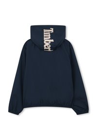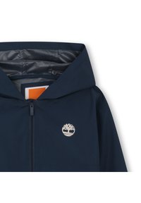 Veste à capuche bleu marine avec fermeture éclair complète à l'avant, poignets élastiques et logo d'arbre blanc sur la poitrine gauche.