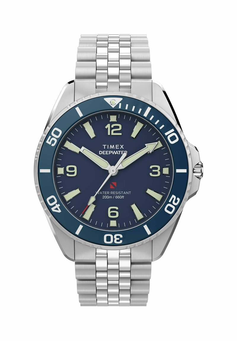 Montre de plongée Timex Deepwater en acier inoxydable avec cadran bleu, aiguilles et index lumineux, résistance à l'eau jusqu'à 200 m/660 pieds.