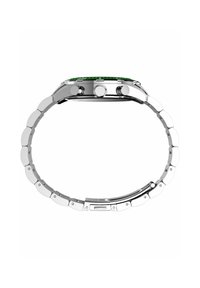 Montre-bracelet en métal argenté avec cadran vert, trois sous-cadrans, aiguille des secondes rouge, affichage de la date, et repères horaires ainsi que aiguilles blanches et épaisses.
