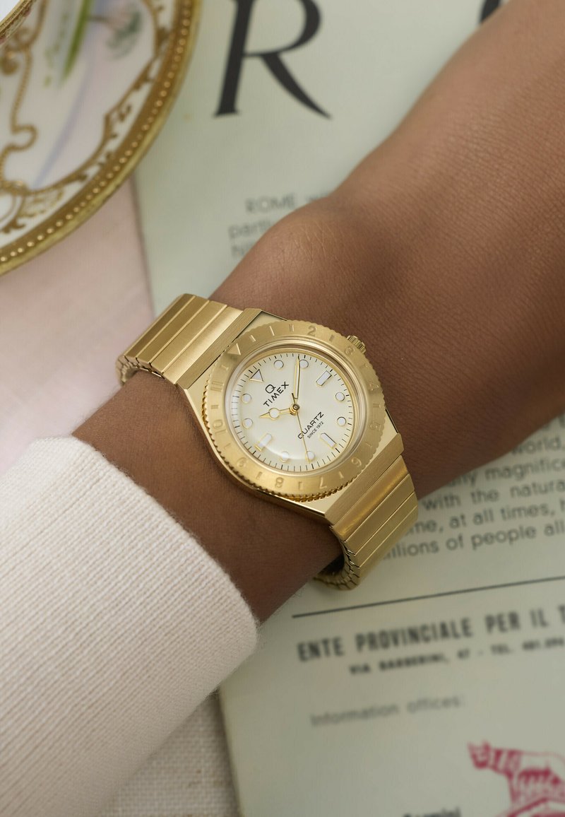 Montre-bracelet Timex dorée avec cadran blanc et bracelet en métal sur un poignet à la peau foncée, par-dessus un pull clair, reposant sur un document.