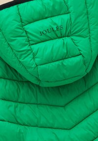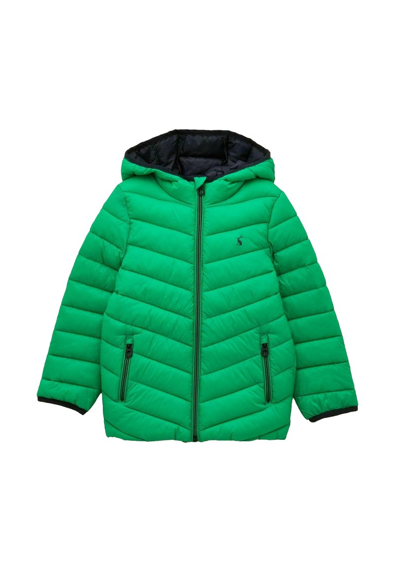 Veste matelassée verte à capuche avec fermeture éclair frontale complète, deux poches latérales zippées et doublure intérieure noire.