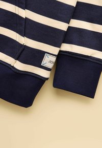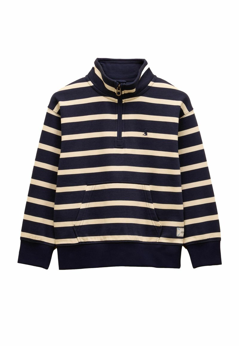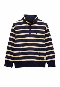 Pull-over à rayures bleu marine et beige avec col demi-fermeture éclair, poche kangourou avant et poignets et ourlet côtelés.