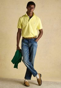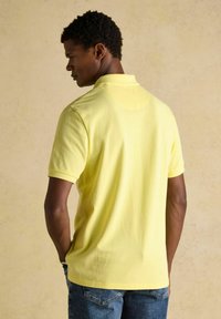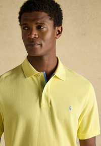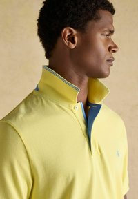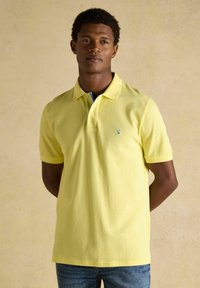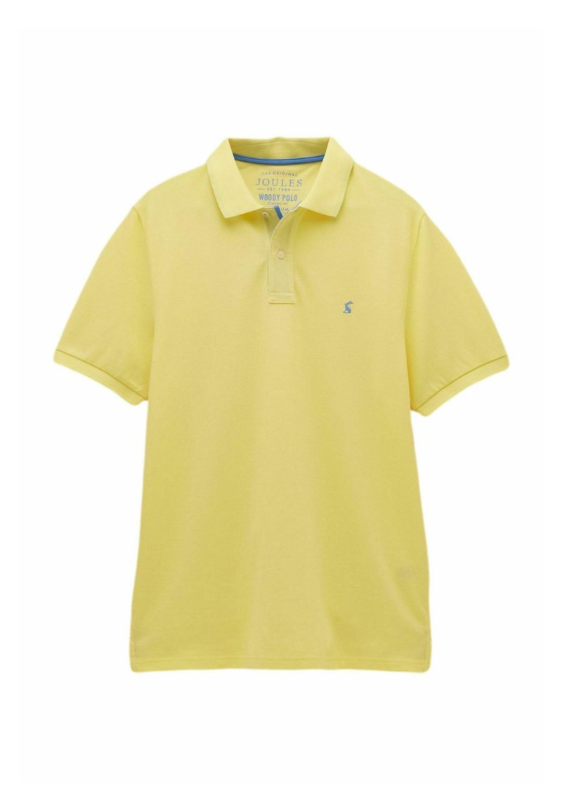 Polo jaune à manches courtes avec patte de boutonnage à deux boutons et petit logo brodé bleu sur la poitrine gauche.