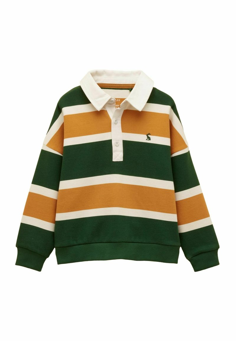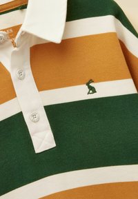 Maillot de rugby à manches longues avec rayures horizontales vertes, moutarde et blanches, col blanc, patte de boutonnage et petit logo brodé sur la poitrine.