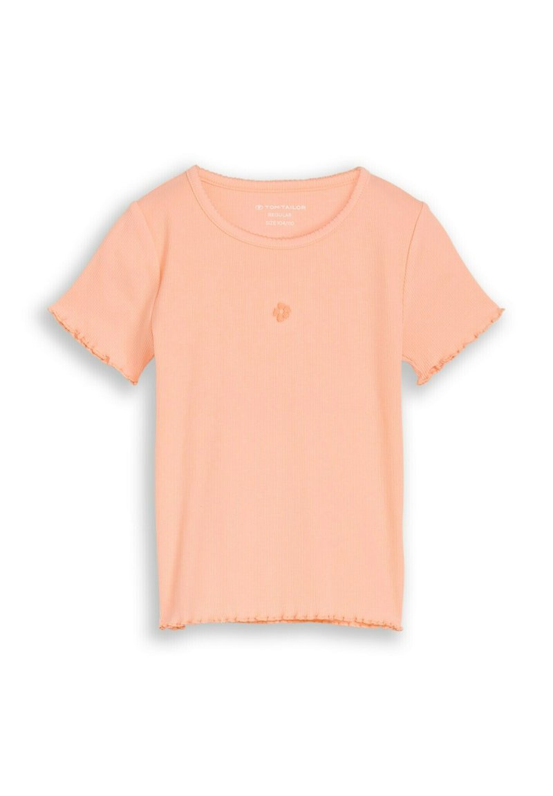 T-shirt à manches courtes, couleur pêche, en tissu côtelé avec bordure frisée sur les manches et l'ourlet, et petit détail de fleur brodée au centre de la poitrine.