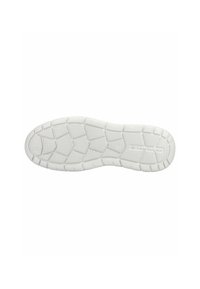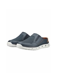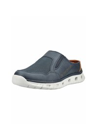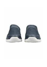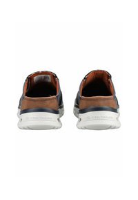 Baskets à enfiler bleu marine avec accent brun au talon, semelle blanche ventilée et logo "Tom Tailor" sur le côté.