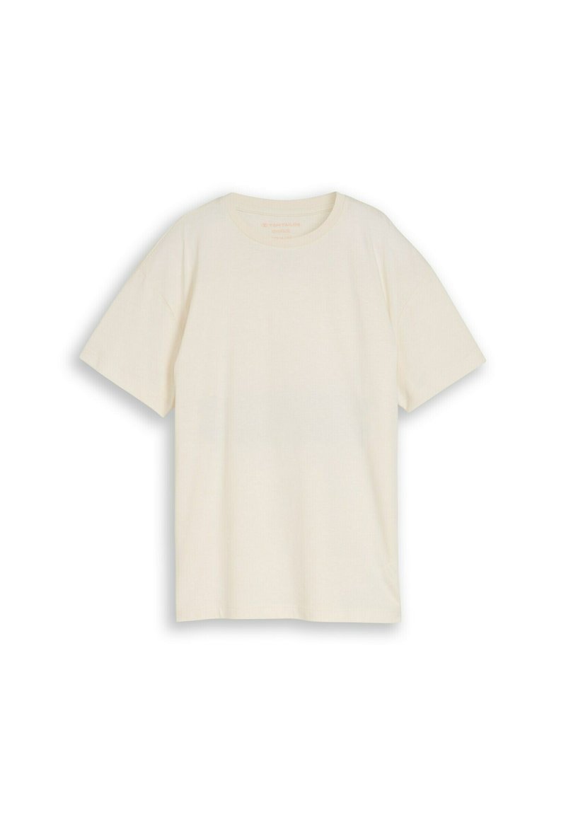 T-shirt en coton à manches courtes, col rond, de couleur blanc cassé uni, posé à plat sur fond blanc.
