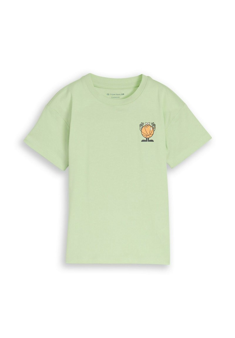 T-shirt vert clair à manches courtes avec un petit personnage de basket-ball en dessin animé montrant des signes de paix sur le côté gauche de la poitrine.