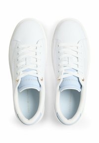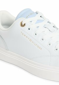 Baskets basses blanches avec languette de talon bleu clair, lacets blancs et logo "Tommy Hilfiger" doré sur le côté.
