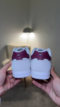Baskets blanches basses avec accents en daim beige, patch talon bordeaux, lacets blancs, et logo "Tommy Hilfiger" sur le côté.