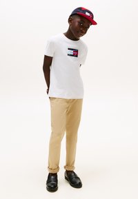 Garçon portant une chemise blanche à manches courtes avec un logo Tommy multicolore et un pantalon beige, debout avec une main dans la poche.