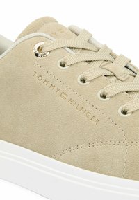 Baskets basses en daim beige avec semelle en caoutchouc blanche, fermeture à lacets à l'avant, et un discret logo Tommy Hilfiger sur le côté.