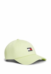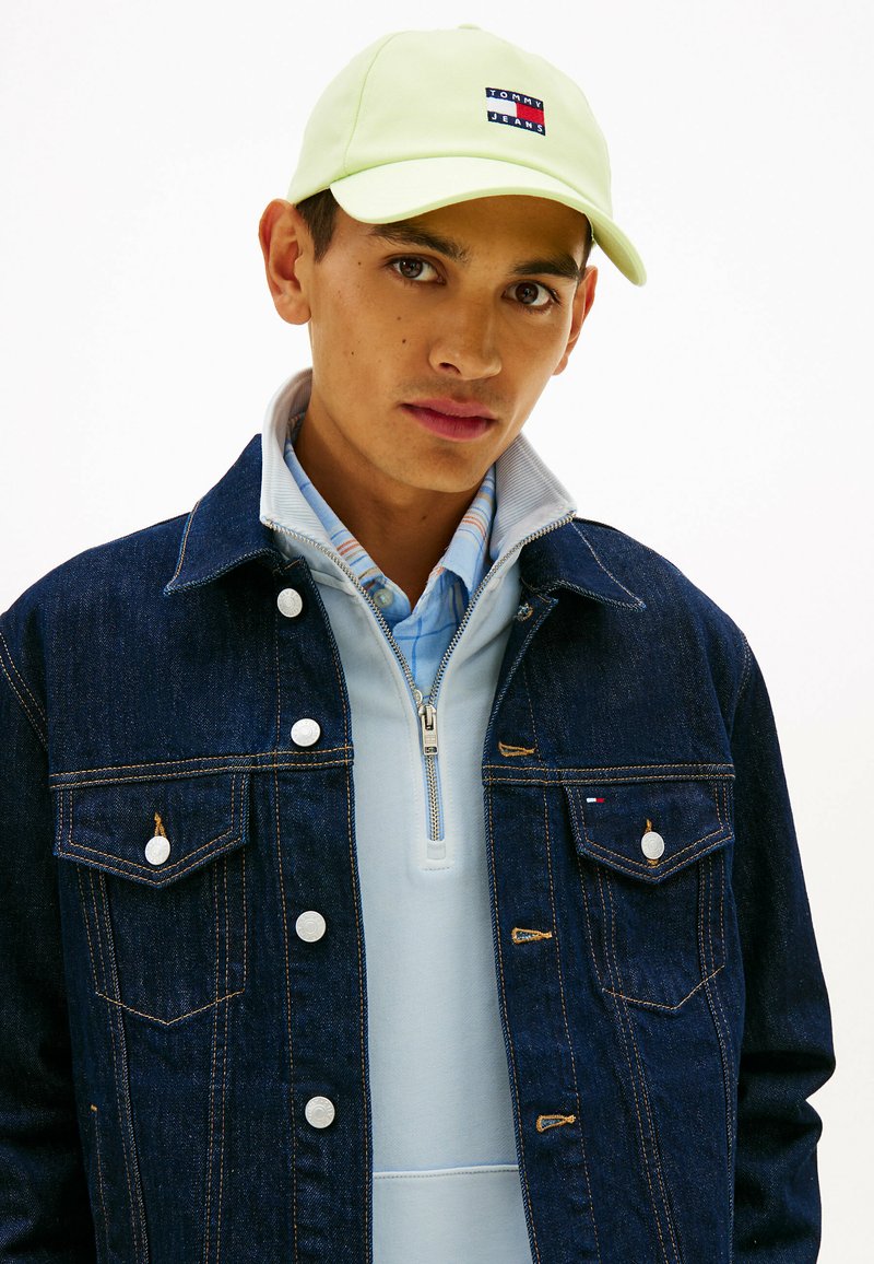 Jeune homme portant une casquette Tommy Jeans vert citron, un pull zippé bleu clair superposé, une chemise à carreaux et une veste en denim foncé avec des boutons pression.
