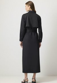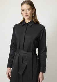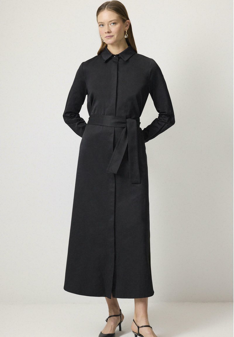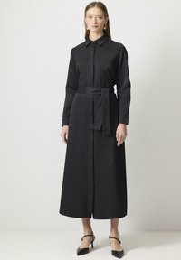 Femme portant une robe chemise noire midi à manches longues avec un col, une ceinture à la taille et des talons noirs à brides, debout devant un fond clair uni.
