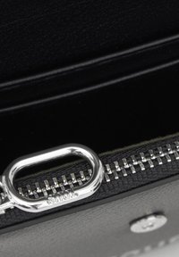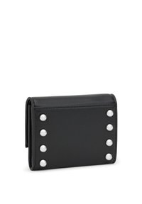 Main tenant un portefeuille en cuir noir avec des clous en métal, une fermeture éclair frontale, et le nom de la marque "TOUS" sur un fond blanc uni.