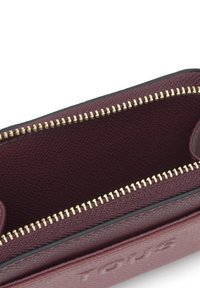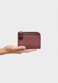 Main tenant un petit portefeuille bordeaux avec le texte "TOUS" en relief et une tirette de fermeture éclair en forme d'ours sur un fond clair uni.