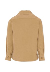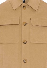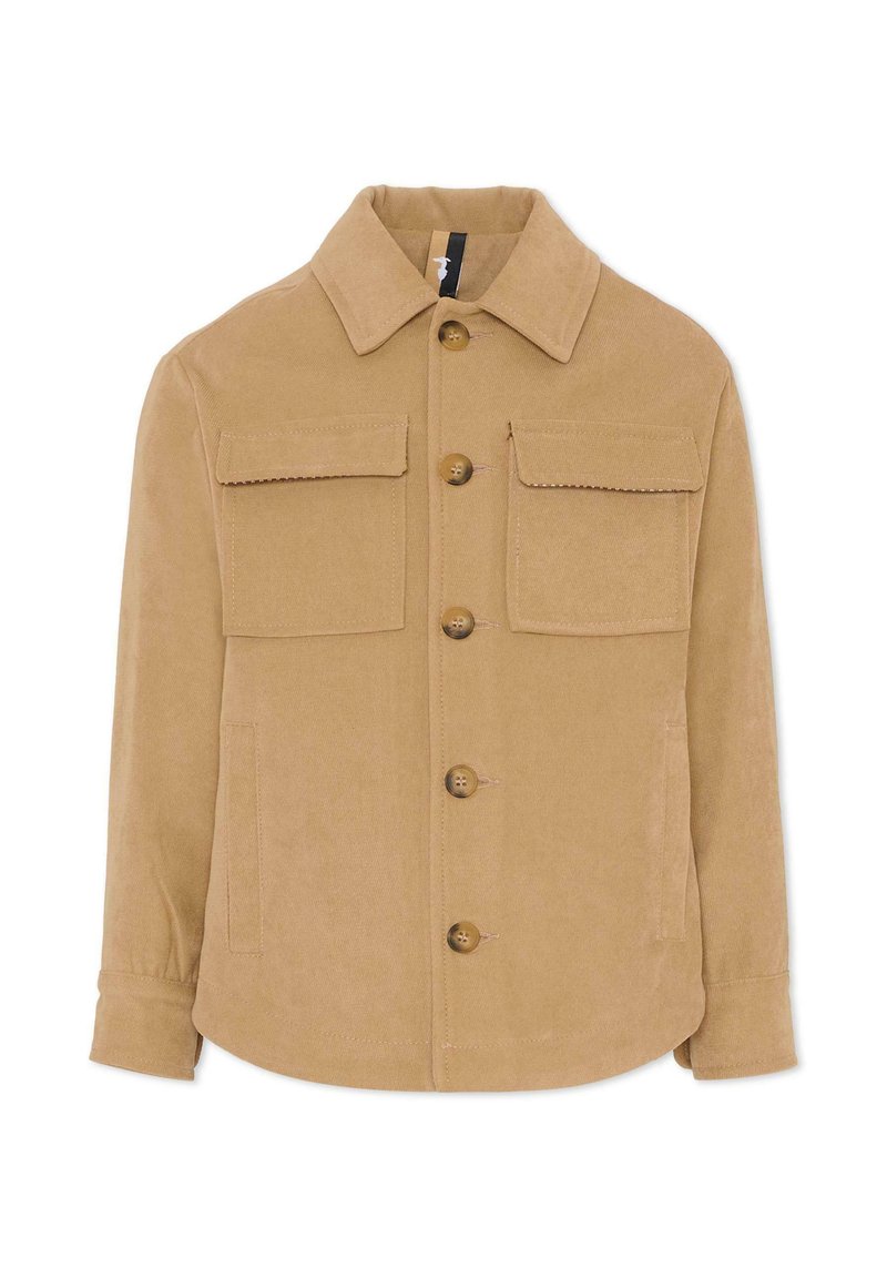 Veste en corduroy beige avec un col, fermeture à boutons, deux poches poitrine et deux poches latérales. Elle présente une coupe droite et un tissu texturé.