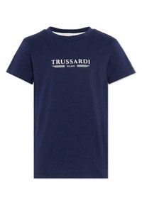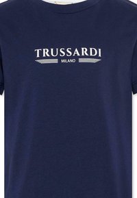 T-shirt bleu marine à manches courtes avec l'inscription "TRUSSARDI MILANO" imprimée en blanc sur la poitrine.