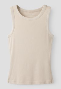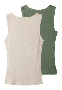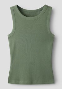 Femme aux longs cheveux ondulés portant un haut vert sans manches et un pantalon blanc, souriant, les mains doucement jointes devant elle.