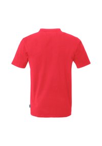 Polo rouge à manches courtes avec col et trois boutons, arborant le logo blanc "uhlsport" sur le côté gauche de la poitrine.