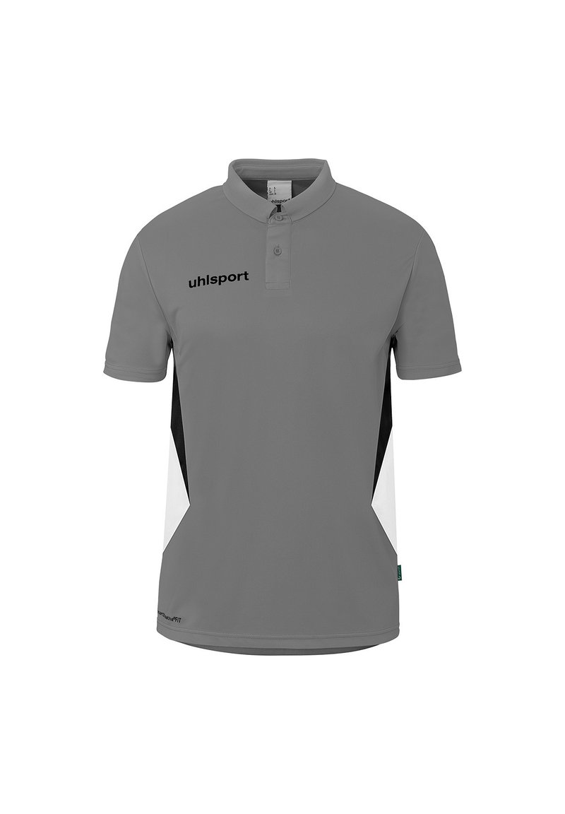Polo gris à manches courtes avec des panneaux latéraux noirs et blancs et le logo "uhlsport" sur le côté gauche de la poitrine.