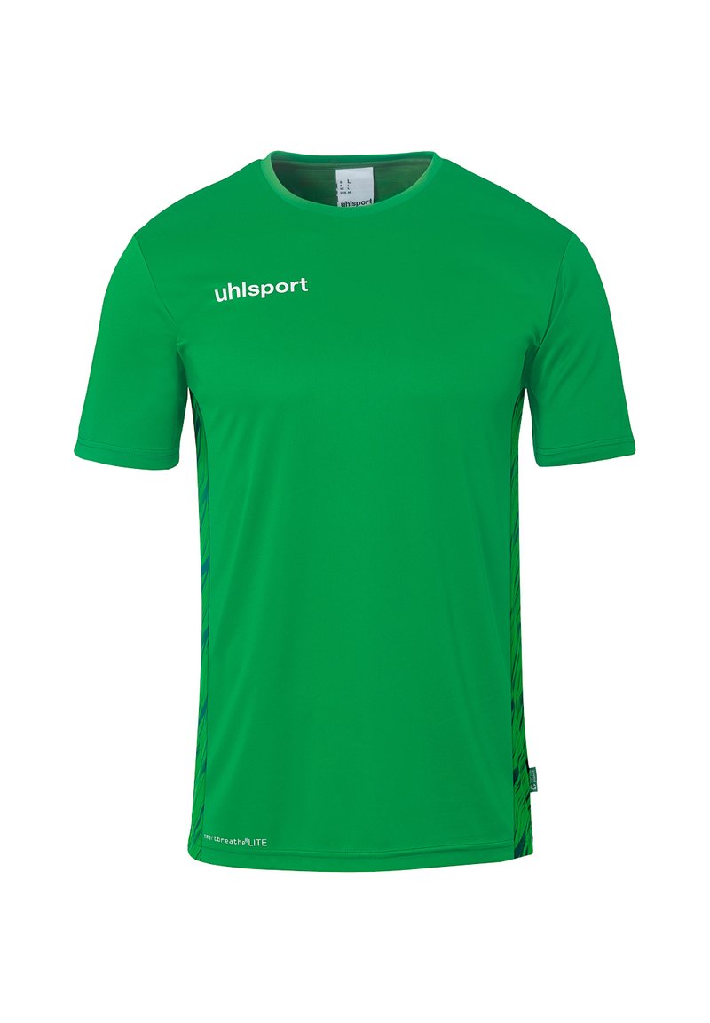 T-shirt de sport vert à manches courtes, fabriqué à partir d'un tissu qui évacue l'humidité, avec un col rond et des rayures verticales contrastantes sur les côtés.
