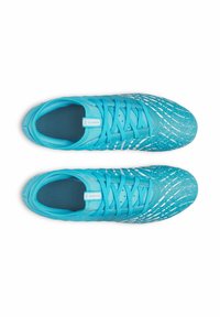 Crampon de football turquoise avec motifs géométriques blancs, lacets et crampons moulés sur la semelle, présenté en profil droit.