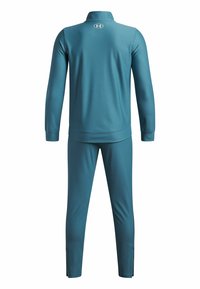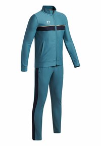 Ensemble de sport couleur bleu sarcelle en tissu lisse comprenant une veste zippée avec une bande marine et un pantalon avec des bandes latérales et un logo.