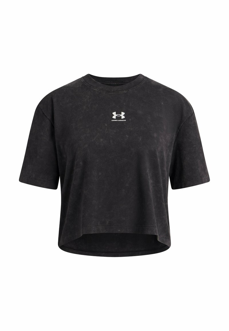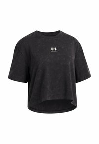 T-shirt noir court en tissu doux, avec des manches courtes amples et un logo Under Armour blanc sur la poitrine. Finition texturée.