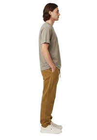 Jeune homme debout, portant un t-shirt taupe à manches courtes, un pantalon marron à cordon de serrage et des baskets blanches, devant un fond uni.