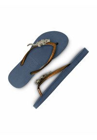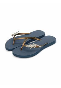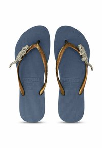 Tongs bleues avec un semelle texturée. Les brides métalliques bronze comportent un accent décoratif en argent. Design plat pour un port décontracté.