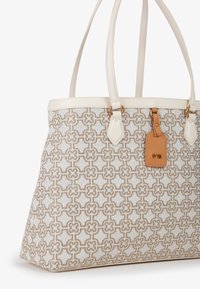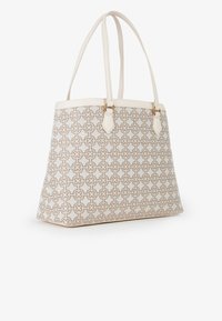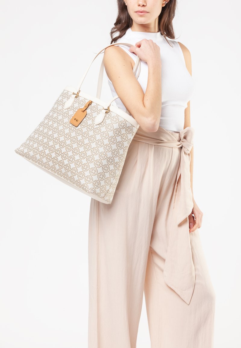 Femme tenant un sac cabas beige à motifs sur l'épaule, portant un haut blanc sans manches et un pantalon beige taille haute avec un nœud à la taille.