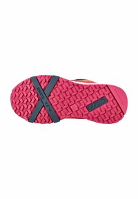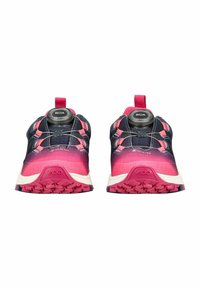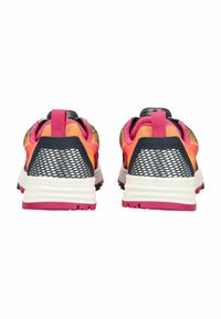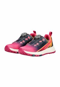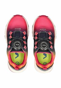 Chaussure de trail running rose, orange et noire avec semelle blanche, dotée d'une languette de traction et d'un système de fermeture à lacets à molette.