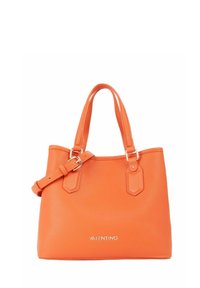 Sac à main texturé beige avec deux poignées courtes, une bandoulière amovible et des accessoires en métal doré. Présente le logo "VALENTINO" sur le devant.
