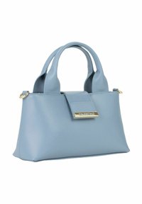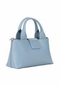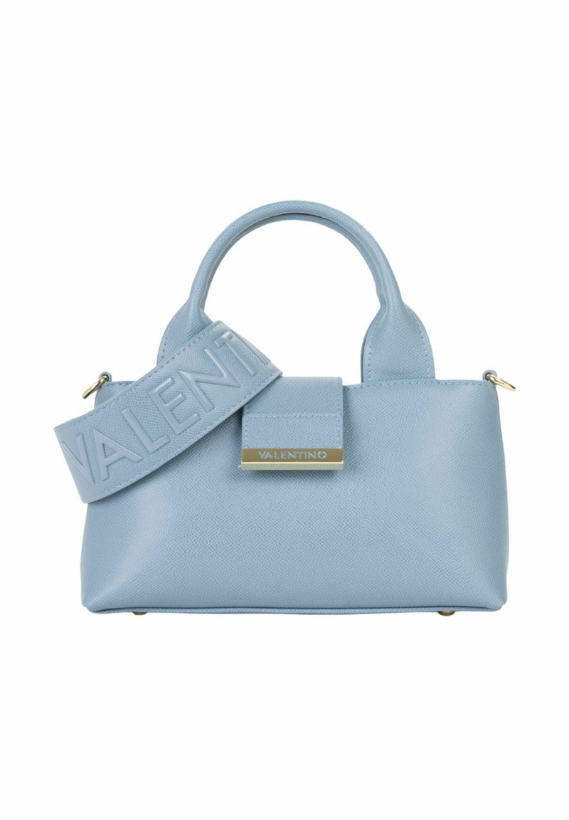 Sac à main Valentino bleu clair avec finition texturée, double poignées arrondies, large bandoulière embossée du nom "Valentino", et plaque logo dorée.