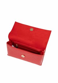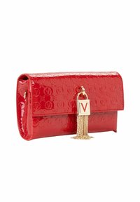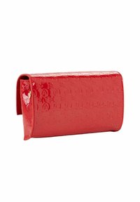 Pochette en cuir verni rouge avec motifs circulaires embossés, bride à boucle dorée et fermeture à verrou doré avec détail de pampille en chaîne sur le rabat avant.