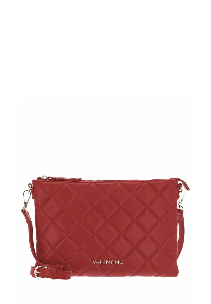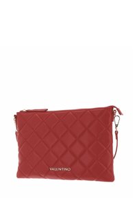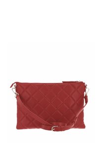 Pochette en cuir rouge avec motif matelassé en forme de losange, fermeture éclair et bandoulière amovible. Dotée de ferrures dorées et du logo de la marque embossé.